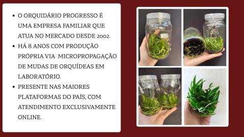 O Orquidário Progresso é uma empresa familiar, que atua na produção e venda de orquídeas desde o ano de 2002. Atualmente, o atendimento é exclusivamente online, somando mais de 5.000 vendas concretizadas no último ano. Nossos envios são diários para pedidos com confirmação de pagamento até as 9:00, de segunda a sexta.